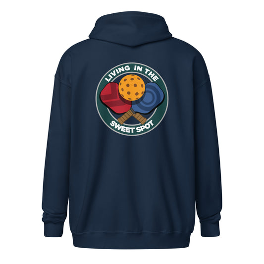 Pickleball Zip Hoodie - "Living in the Sweet Spot" - Crossed Paddles (pocket + back)